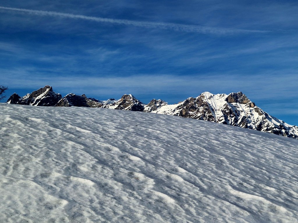 Die Schneedecke ist mehr als dünn und der Föhn meint es nicht besonders gut mit mir. Er bläst so kräftig, dass ich zwischendurch wirklich überlege, ob ich nicht gleich wieder ins Tal zurück segeln sollte.