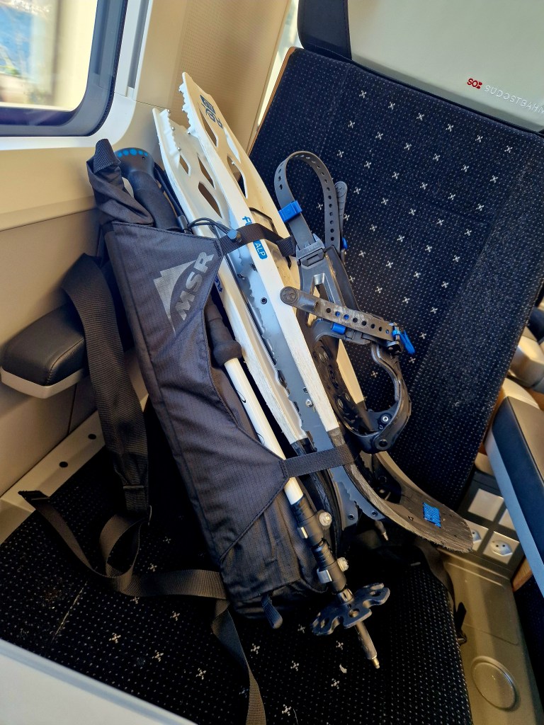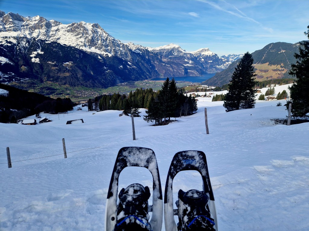 Wanderwege und Strassen sind komplett vereist. Die Einheimischen erzählen mir, ohne Schneeketten an den Schuhen gehe hier kaum noch jemand aus dem Haus. Da fühlen sich meine Schneeschuhe plötzlich wie eine ziemlich kluge Entscheidung an.