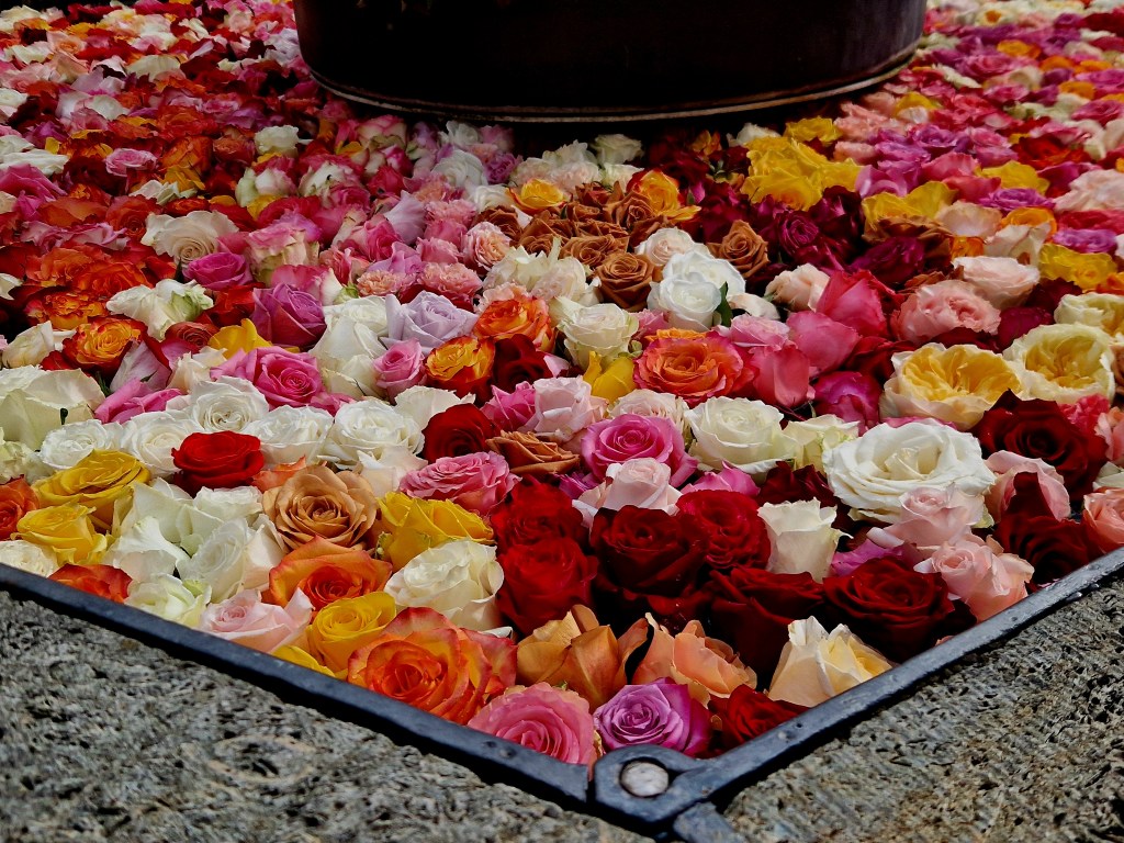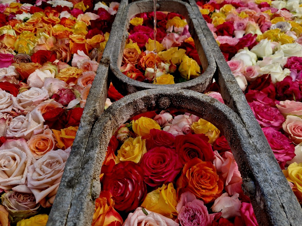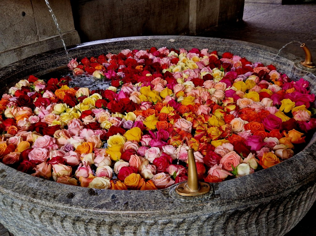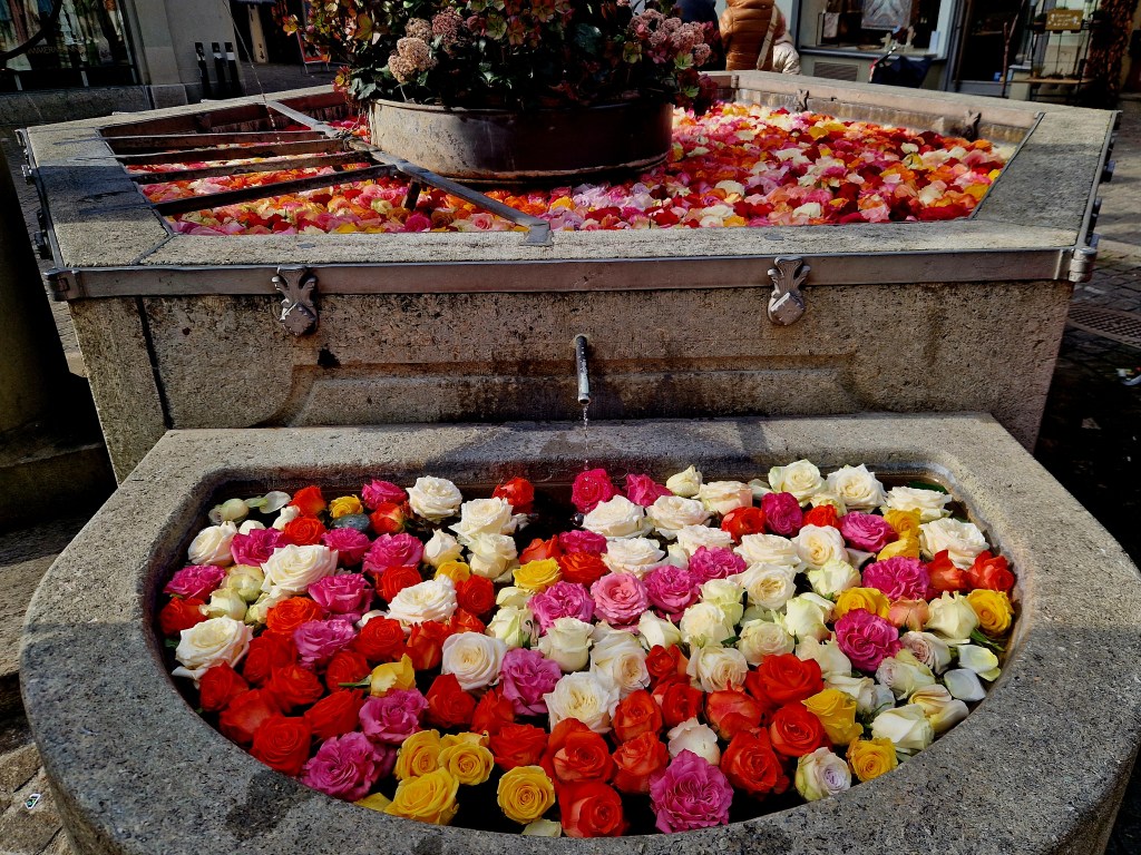 Und genau so eine Zeit ist die Karwoche. Vier Brunnen in der Altstadt tragen plötzlich ein ganz besonderes Kleid. Rosenköpfe, die sanft auf dem Wasser treiben. Weiss, gelb, orange, rosa, rot. Kleine Farbtupfer, die einem ein Lächeln ins Gesicht zaubern. Und das Schönste daran, es reicht schon ein kurzer Spaziergang durch die Gassen, um diesen stillen Zauber zu entdecken.